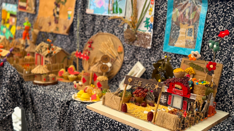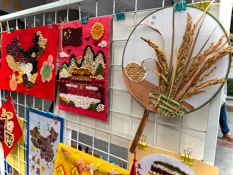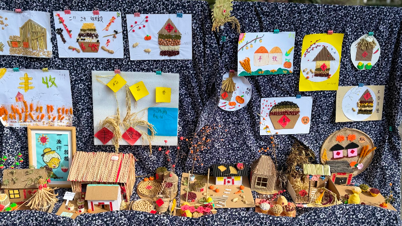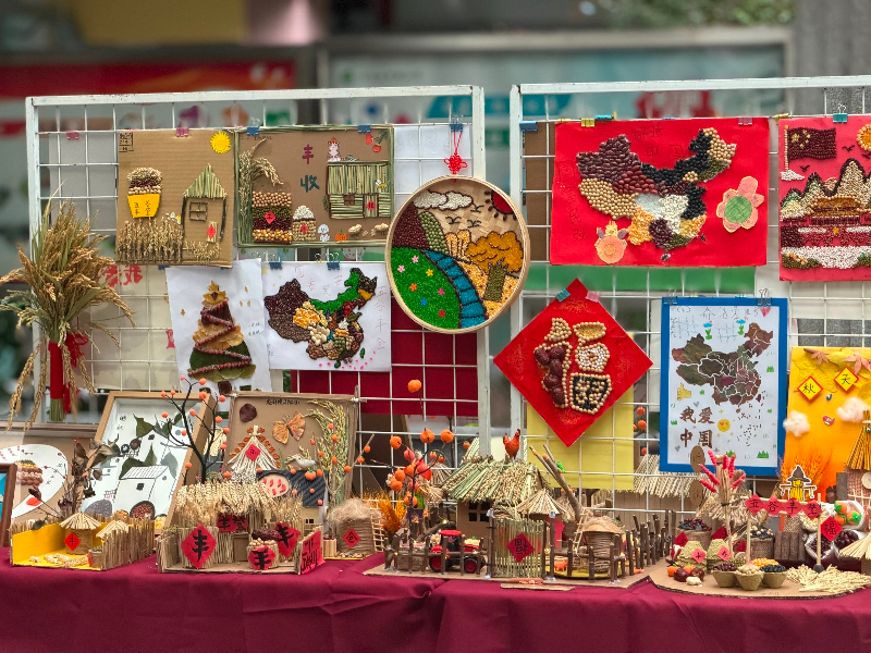 总部学生作品中,稻穗编织的花束致敬先烈、彩豆拼贴的山河展现盛世,将爱国情怀与丰收主题深度融合;