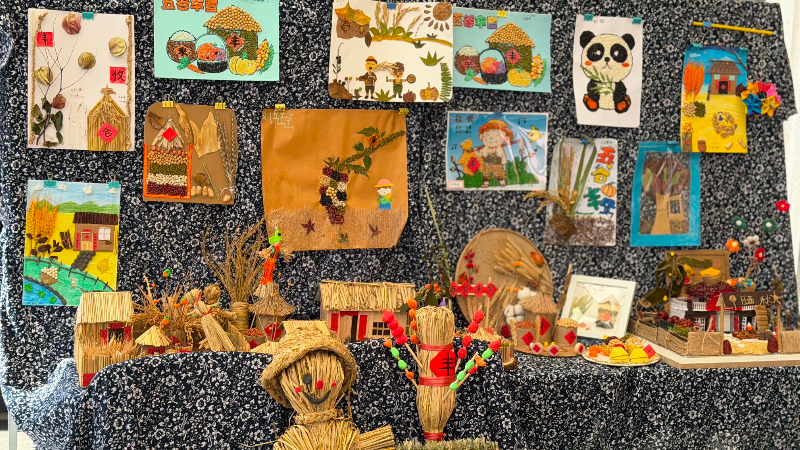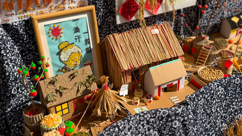分部学生作品里,五谷拼贴的场景充满烟火气,稻草、豆子制作的形象憨态可掬,尽显童真创意。