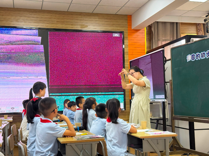 第二堂课由华新小学徐亦欢老师执教《圆的初步认识》。徐老师紧扣教学目标,从生活实例出发,引导学生通过描圆、合作画圆、圆规作图等层层递进的实践活动,自主建构“定点、定长、旋转一周”的圆概念本质,将操作体验与概念学习相结合,让学生在对比辨析中理解圆心、半径的核心特征及其关系。